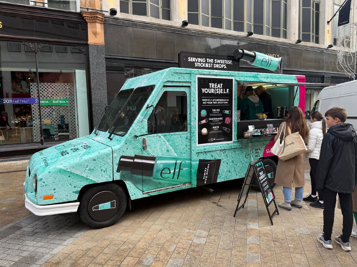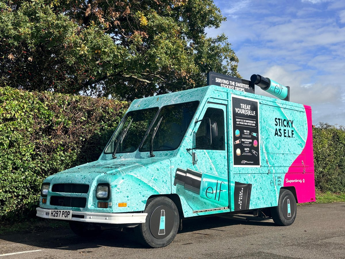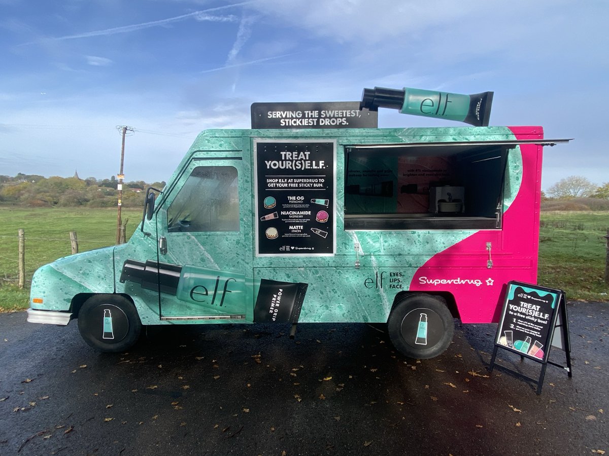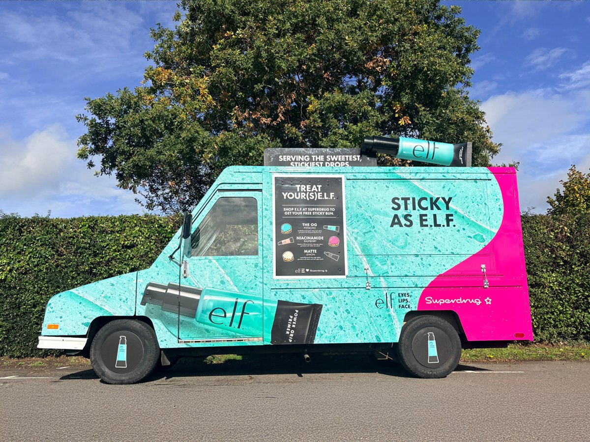 Beauty brand e.l.f., in collaboration with Superdrug, hired our utilimaster for their recent campaign. The van visited multiple locations, serving up glazed buns to Superdrug customers. The vibrant design, wheel covers, and rooftop prop really made the vehicle stand out.